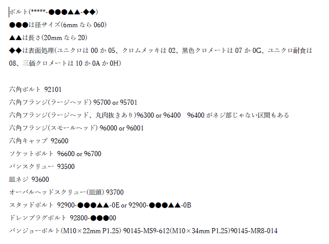 今回見つけたボルトの品番は例を挙げると